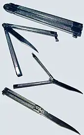 - Складными ножами особого типа считают также куботаны со спрятанными в рукояти клинками. Такой куботан состоит из полой рукояти с внутренней резьбой и отвинчивающейся части, с одной стороны которой — заострённый боёк-стеклобой, а с другой — длинный узкий клинок, который обычно спрятан внутри рукояти. Для того, чтобы привести такой нож в боевое положение, нужно отвинтить эту часть от рукояти, перевернуть и снова привинтить, но уже клинком наружу, а бойком внутрь рукояти