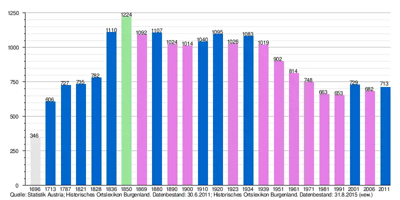 Источники: 1. Historisches Ortslexikon Burgenland. Datenbestand: 30.6.2011.[14] 2. Historisches Ortslexikon Burgenland. Datenbestand: 31.8.2015.[10]