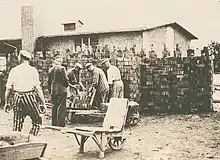 Работа в главном лагере была сосредоточена на кирпичном производстве в первой половине войны. Это включало в себя строительство канала на небольшом ответвлении реки Эльбы, расположенном на территории лагеря, для транспортировки сырья из Гамбурга. Заключенные были вынуждены, независимо от погодных условий и состояния здоровья, выкапывать тяжелый торфяной грунт ненадлежащими орудиями труда. После того, как заключенные закончили строительство нового кирпичного завода в 1942 году, одним из самых густонаселенных заданий была работа в глиняном карьере, добыча и транспортировка глины из главного лагеря для производства кирпича.[17] Строительство канала, выкапывание глины и транспортировка грунта были известны как три «смертельных коммандоса». Квалифицированный труд почти всегда давали заключенным на верхних ступенях арийской иерархии.[18]