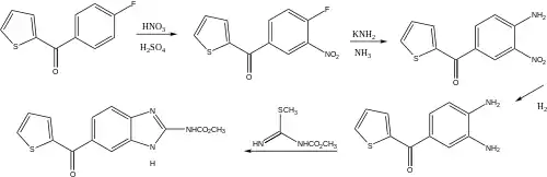 Нокодазол может быть синтезирован из (4-фторфенил)(тиофен-2-ил)метанона.