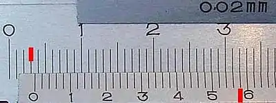 В середине фотографии видна основная шкала, вверху указана цена деления нониуса — 0,02 мм.
