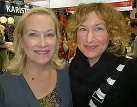 ![]() Тийна Нопола (слева) и иллюстратор Мерви Линдман. Хельсинкская книжная ярмарка, октябрь 2011 | |