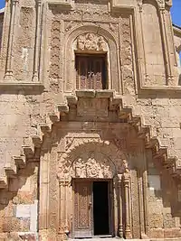 Западный вход украшен с особым великолепием. Важную роль здесь играют консольные лестницы с профилированными стыками, ведущие на второй этаж. Двери обрамлены широкими прямоугольными наличниками с уступами в верхней части, колоннами, перевязями и самым изысканным, геометрически правильным и разнообразным орнаментом. Между внешним наличником и арочным обрамлением отверстий можно увидеть изображения голубей и сирен с женскими венценосными головами. Подобные геральдические барельефы широко использовались в армянской живописи XIV века, а ещё раньше — в архитектуре, миниатюрах и прикладном искусстве для декорирования различных сосудов и чаш. Дверные тимпаны украшены горельефами: на нижнем этаже на них изображена Пресвятая Дева с Младенцем Христом и Архангелами Гавриилом и Михаилом, а на верхнем этаже — фигуры Апостолов Петра и Павла. В отличие от барельефов в молельне Нораванка, эти горельефы выгравированы на гладкой поверхности, что делает их ещё более независимыми. Фигуры отличаются пластичностью форм, мягкой лепкой и акцентированием некоторых деталей одежды.