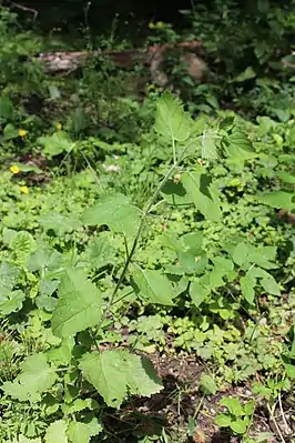 Стебель прямой, крупный, с крупными цельными широкояйцевидными, острыми, двоякозубчато-пильчатыми супротивными листьями.