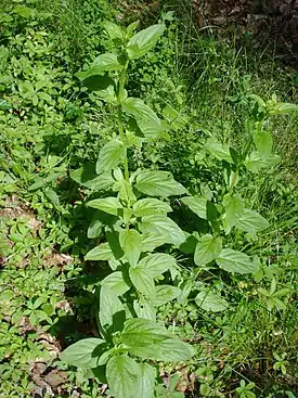 Стебли прямостоячие, четырёхгранные, грани их и черешки листьев перепончато-окаймлённые, голые. Пластинки листьев продолговато-яйцевидные, от 4 до 9 см длиной и от 1,5 до 5 см шириной, тупые или коротко заострённые, с округлым, реже едва сердцевидным основанием, по краю пиловидно- или городчато-зубчатые, голые.
