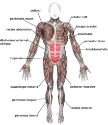 В состав опорно-двигательной системы входят поперечно-полосатые мышцы (скелетные мышцы). Мышцы — это активная часть опорно-двигательного аппарата. Большинство мышц крепятся к костям скелета двумя концами с помощью сухожилий.