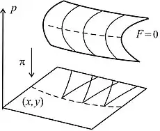 Дифференциальное соотношение задает в пространстве поле контактных плоскостей . Пересечение контактных плоскостей с плоскостями, касательными к поверхности , задает на последней поле направлений (определенное во всех точках, где контактные и касательные плоскости не совпадают друг с другом). Интегральные кривые построенного таким образом поля являются 1-графиками решений исходного уравнения, а их проекции на плоскость — графиками решений[4][5]