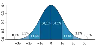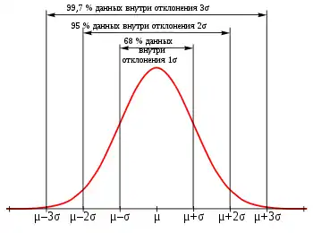 Для нормального распределения количество значений, отличающиеся от среднего на число, меньшее чем одно стандартное отклонение, составляют 68,27 % выборок. В то же время количество значений, отличающиеся от среднего на два стандартных отклонения, составляют 95,45 %, а на три стандартных отклонения — 99,73 %.