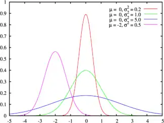 Норма́льное распределе́ние[1][2], также называемое распределением Гаусса или Гаусса — Лапласа[3] — распределение вероятностей, которое в одномерном случае задаётся функцией плотности вероятности, совпадающей с функцией Гаусса: