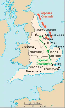 Подготовку к отражению нормандского вторжения вёл и английский король. Он созвал национальное ополчение с юго-восточных областей Англии и разместил войска вдоль южного побережья. Быстрыми темпами формировался новый флот, во главе которого встал король. В мае Гарольду удалось отразить набег своего мятежного брата Тостига на восточные регионы страны. Однако в сентябре англосаксонская система военно-морской обороны развалилась: нехватка продовольствия заставила короля распустить ополчение и флот[17]. В середине сентября в северо-восточной Англии высадилась армия норвежского короля Харальда Сурового. Соединившись со сторонниками Тостига, норвежцы разгромили 20 сентября ополчение северных графств в битве при Фулфорде и подчинили Йоркшир. Король Англии был вынужден оставить свои позиции на южном побережье и стремительно двинуться на север. Объединив своё войско с остатками ополчения, 25 сентября в сражении при Стамфорд-Бридже Гарольд наголову разгромил викингов, Харальд Суровый и Тостиг были убиты, а остатки норвежской армии отплыли в Скандинавию. Однако значительные потери, понесённые англичанами в битвах при Фулфорде и Стамфорд-Бридже, особенно среди королевских хускарлов, подорвали боеспособность армии Гарольда[18].