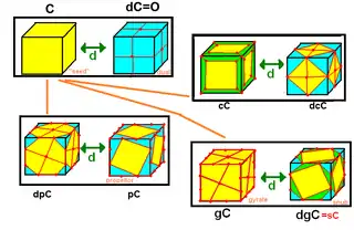 | z | ![]() | zip | dk = td dnd | 2e | 3e | v+f | Двойственный многогранник к затравке после операции kis или усечение двойственного многогранника. Операция создаёт новые рёбра, перпендикулярные исходным рёбрам. Операция также называется bitruncation (глубоким усечением). Эта операция преобразует многогранник Голдберга G(a,b) в G(a+2b,a-b) для a>b. Она также преобразует G(a,0) в G(a,a), G(a,a) в G(3a,0), G(2,1) в G(4,1) и т.д. |