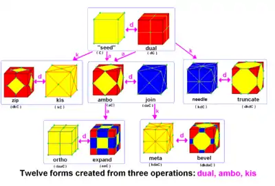 Конвей и Харт расширили идею использования операторов, подобных оператору truncation (усечения), определённого Кеплером, чтобы создавать связанные многогранники с той же симметрией. Базовые операторы могут сгенерировать все архимедовы тела и каталановы тела из правильных затравок. Например, tC представляет усечённый куб, а taC, полученный как t(aC), является усечённым октаэдром. Простейший оператор dual (двойственный) меняет местами вершины и грани. Так, двойственным многогранником для куба является октаэдр — dC=O. Применённые последовательно, эти операторы позволяют сгенерировать многие многогранники высокого порядка. Получающиеся многогранники будут иметь фиксированную топологию (вершины, рёбра, грани), в то время как точная геометрия не ограничивается.