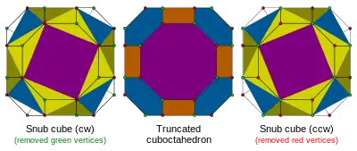 | s rs=s | ![]() | snub | dgd = dg | 2e | 5e | v+2e+f | «расширение и кручение» – каждая вершина образует новую грань, а каждое ребро образует два новых треугольника |