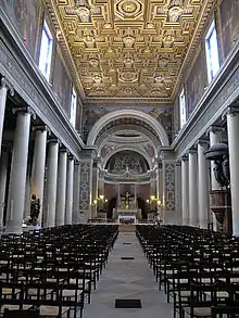 В интерьере церкви выделяется живописное изображение «Коронование Девы Марии» над апсидой, авторства Франсуа Эдуара Пико. Сюжет картины над хорами посвящён легенде о переносе дома Девы Марии из Назарета в Лорето ангелами. Золочёный потолок церкви — прямое подражание потолку базилики Санта-Мария-Маджоре. Четыре часовни, окружающие неф, посвящены четырём христианским таинствам: крещению, евхаристии, браку и елеопомазанию. Около колонн главного нефа — несколько статуй Девы Марии различных мастеров.
