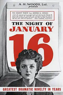 Премьера спектакля состоялась в 1934 году в Голливуде под названием «Женщина в суде». Постановка получила хорошие отзывы и имела умеренный коммерческий успех. Через год после премьеры театральный продюсер Эл Вудс перенёс спектакль на Бродвей и переименовал его в «Ночь 16 января». Спектакль привлёк широкое внимание необычным участием в нём зрителей и стал хитом. После этого последовали постановки этого спектакля в нескольких других театрах в США. В 1941 году по мотивам пьесы был снят фильм. Пьесу также адаптировали для вещания по телевидению и радио.