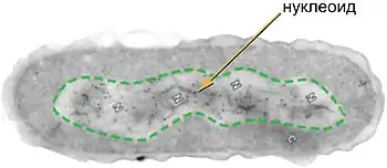 Нуклео́ид (англ. Nucleoid) — неправильной формы зона в цитоплазме прокариотической клетки, в которой находится геномная ДНК и ассоциированные с ней белки. На долю ДНК приходится около 60 % массы нуклеоида; помимо ДНК, нуклеоид содержит РНК и белки[1]. Белки нуклеоида, которые обеспечивают пространственную организацию геномной ДНК, называют нуклеоидными белками или нуклеоид-ассоциированными белками; они не имеют ничего общего с гистонами, упаковывающими ДНК у эукариот. В отличие от гистонов, ДНК-связывающие белки нуклеоида не формируют нуклеосомы и обеспечивают компактизацию геномной ДНК другим способом[2]. Несмотря на аморфную форму, отдельные гены располагаются в нём упорядоченно[3].