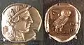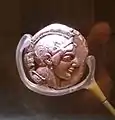 Серебряная декадрахма, правый профиль богини Афины в шлеме. Афины, 467—465 годы до н. э.