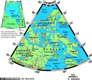 В 1870 году компания Гудзонова залива передала свои земли только что созданному доминиону Канада. Владения компании включали землю Руперта и Северо-западную территорию[28]. Однако северные острова Нунавута не принадлежали напрямую компании — более того, часто их исследователями и первооткрывателями были скандинавы или американцы. В июле 1880 года британское правительство передало Канаде свои арктические владения со следующей формулировкой: «Все острова, лежащие около таких территорий» (англ. All Islands adjacent to any such Territories), включая ещё не открытые острова, а также острова, открытые иностранцами[29].