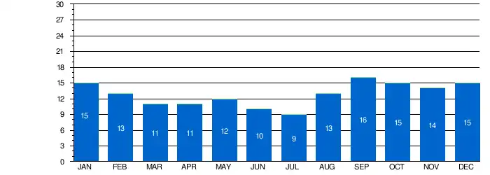 На приведённой ниже диаграмме синие полоски показывают среднее количество дождливых дней в месяц. День считается дождливым, если выпало более 1 мм осадков. Среднее берется по метеорологическим наблюдениям за последние 10 лет[16].