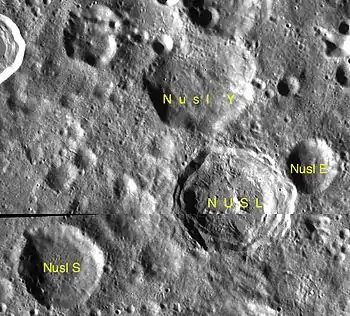 - Образование сателлитных кратеров Нушл S и Y относится к нектарскому периоду[1].