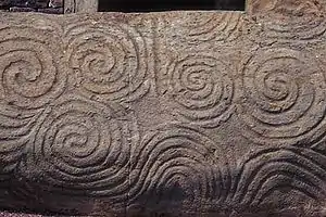 Вход в гробницу отмечал круг камней высотой от 1,5 до 2,5 м. Ещё один круг из 97 вертикально стоящих камней окружал по периметру саму гробницу. Все эти камни, а также стены коридора и погребальной камеры покрыты орнаментом, состоящим из зигзагообразных линий, треугольников, концентрических кругов, но наиболее часто встречается изображение тройной спирали. Этот символ был широко распространен в неолитическом искусстве и, как предполагают исследователи, был связан с циклом смерти и возрождения (в частности, аналогичные символы вырезаны на резных каменных шарах — характерных артефактах той же эпохи). Большинство изображений спирали располагается при входе в гробницу, как бы обозначая границу между миром мертвых и миром живых. Также среди мотивов изображений встречаются чашевидные знаки и концентрические кольца.