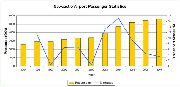 Ньюкасл стал первым региональным аэропортом Великобритании, в котором установлены киоски самообслуживания общего использования в терминале, которые дают возможность пассажирам регистрироваться непосредственно без очереди к обычным стойкам регистрации. В 2006 было перевезено рекордное количество пассажиров — 5.4 млн.
