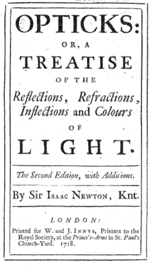 Ньютон построил первый практический телескоп-рефлектор и разработал теорию цвета, основанную на наблюдении, что призма разделяет белый свет на цвета видимого спектра, тем самым заложив основы современной физической оптики. Его работы о свете были собраны в его книге «Оптика», опубликованной в 1704 году.