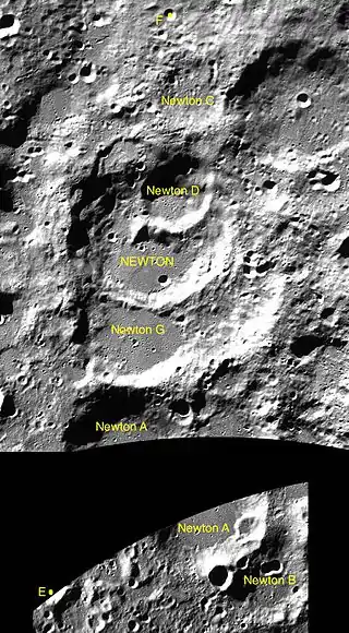 - Образование сателлитных кратеров Ньютон A и G относится к донектарскому периоду[1].