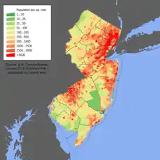 слушать)) — штат[6] на северо-востоке США[7]. Получил название от острова Джерси в проливе Ла-Манш. Третий по счёту штат, вошедший в союзное государство. Население — 9 294 493 человек (11-е место в США, данные переписи населения США 2020 года).[2] Плотность населения — 467 чел./км² (1-е место в США, данные переписи населения США 2020 года)[2] Этнический состав: итальянцы — 17,9 %, ирландцы — 15,9 %, афроамериканцы — 13,6 %, немцы — 12,6 %, поляки — 6,9 %. Вся территория штата относится к городским агломерациям Нью-Йорка и Филадельфии.