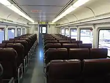 В вагонах установлены полумягкие диваны тёмно-коричневого цвета. Эти диваны можно переворачивать в зависимости от направления движения. Полы устланы линолеумом, стены белые, имеются багажные полки.