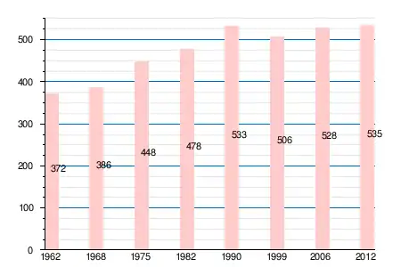 | 1962 | 1968 | 1975 | 1982 | 1990 | 1999 | 2005 | 2006 | 2008 | 2011 | 2012 |