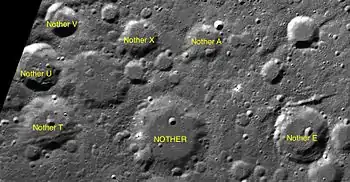 - Образование сателлитного кратера Нётер T относится к нектарскому периоду[1].