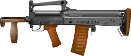 - Непродуманное расположение предохранителя-переводчика режимов огня, оставленного на прежнем (как у АК) месте, которое, учитывая компоновку булл-пап, замедляет операции с ним.