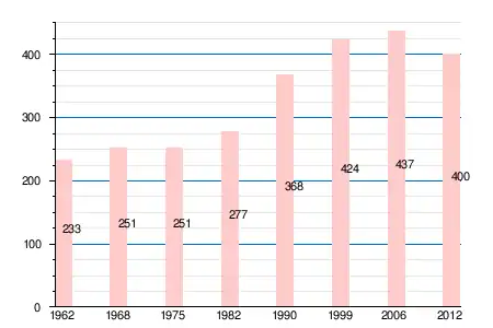 | 1962 | 1968 | 1975 | 1982 | 1990 | 1999 | 2006 | 2007 | 2008 | 2011 | 2012 |