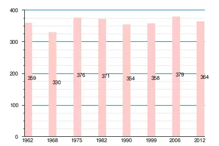 | 1962 | 1968 | 1975 | 1982 | 1990 | 1999 | 2006 | 2007 | 2008 | 2010 | 2011 | 2012 |