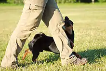 - Движение рядом — собака должна в естественной манере, но заинтересованно и сконцентрировано следовать слева от проводника, передние лапы на уровне ноги хендлера. При остановках проводника собака должна занимать положение сидя слева от ноги, при смене темпа движения также замедляться или ускорятся соответственно. Схема движения рядом заранее составляется судьей соревнований и публикуется для ознакомления участниками. Схема включает в себя движение по прямым разными темпами (обычный шаг, медленный шаг, бег), повороты в движении на 90 и 180 градусов, а также повороты и шаги в стороны и назад на месте.