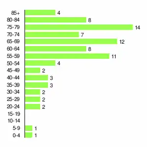 | Жителей | 999 | 1122 | 1035 | 802 | 612 | 354 | 265 | 163 | 84 |