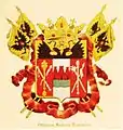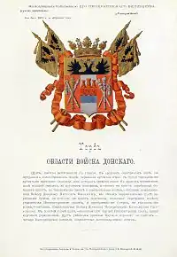 Герб Области Войска Донского, утверждён Всероссийским императором Александром II 5 июля 1878 года. Герб области имел следующее описание: «Щит, дважды рассечённый, с главою. В среднем серебряном поле, на лазуревом волнообразном поясе, червлёная зубчатая стена с тремя таковыми же зубчатыми круглыми башнями, из которых средняя выше. В правом червлёном поле, золотой пернач, за которым положены косвенно на-крест, серебряный бобылев хвост, на таковом же древке, и серебряная же насека — эмблемы, пожалованные Войску Донскому Петром Великим; в левом червлёном же поле, серебряная булава, за которою на-крест положены косвенно, серебряная насека, украшенная Императорским орлом и серебряный же бунчук на таковом же копье — эмблемы, пожалованные Войску Донскому Императрицею Елизаветою Петровною. В золотой главе щита, возникающий чёрный Императорский орёл, тремя коронами украшенный. Щит увенчан Древнею Царскою короною; за щитом, четыре Императорские знамени, соединённые Александровскою лентою».