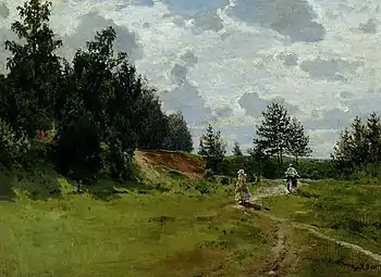 Жанровая сценка, органично вписанная в пейзаж, не отвлекает внимания от изображения природы. Автор очень достоверно передает состояние летнего солнечного дня, с бегущими по небу облаками, с легкими тенями от них. Пейзаж написан в сближенной цветовой гамме зеленых, золотисто-зеленых, золотисто-желтых тонов. В живописном отношении это достигается многообразием и богатством цветовых оттенков, тщательной их разработкой. Пейзаж написан широким мазком[2].