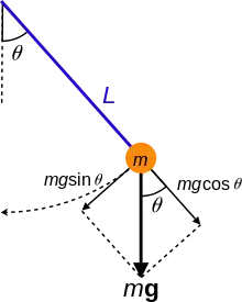 Простой маятник состоит из массы M подвешенной к точке поворота так, что она вынуждена двигаться по окружности радиуса L. Положение массы определяется координатами вектора r=(x, y), измеренными в плоскости окружности, где y соответствует вертикальному направлению. Координаты x и y связаны уравнением окружности