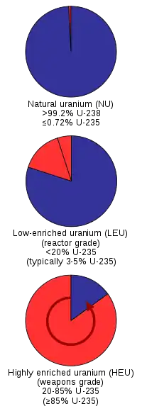 Уран с содержанием 235U до 20 % называют низкообогащённым (НОУ, англ. Low enriched uranium, LEU). Уран с обогащением 2—5 % в настоящее время широко используется в энергетических реакторах по всему миру. Уран с обогащением до 20 % используется в исследовательских и экспериментальных реакторах. НОУ с высоким содержанием проб (High-assay LEU, HALEU) — уран обогащенный до 5–20%.