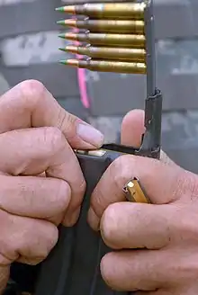 - заряжание из обоймы, патроны в магазин выталкиваются из обоймы, а обойма отбрасывается прочь.