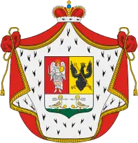 Описание герба: Выписка из Гербовника Щит имеет две части, верхнюю пространную и нижнюю малую, в которой изображены в серебряном поле две птицы, держащие во рту по одной стреле, а в лапах золотые шары. В верхней части, разрезанной перпендикулярной чертой, в правом красном поле ангел в серебрянотканной одежде, держащий в правой руке серебряный меч, а в левой золотой щит. В левой части в золотом поле чёрный одноглавый орел в золотой на главе короной с распростёртыми крыльями, держащий в лапе позолоченный крест. Щит покрыт мантией и шапкой, принадлежащими Княжескому достоинству.