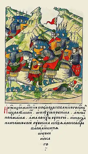 ![]() Гибель Александра Оболенского в битве под Гельмедом. Миниатюра Лицевого летописного свода. | |