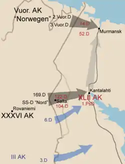 - Армия «Норвегия» (15 января 1942 года она была переименована в Армию «Лапландия», с июня 1942 года — «20-я горная армия») под командованием Николауса фон Фалькенхорста (с 1 июня 1942 года — Эдуарда Дитля, с 28 июня 1944 года — Лотара Рендулича) располагалась в Лапландии, включая район Петсамо. В неё входили 5 немецких и 2 финские дивизии. Наступление поддерживали 5-й воздушный флот под командованием генерала Ганса-Юргена Штумпфа (на мурманском направлении около 160 самолётов), а также части ВВС Финляндии (в беломорокарельской полосе наступления).