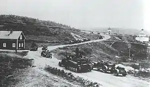 ![]() Немецкие войска движутся на мурманском направлении, июль 1941 года. | |||