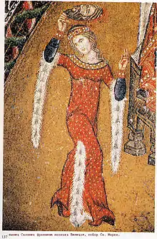 Изящной девушкой с распущенными светлыми волосами предстаёт Саломея на мозаике баптистерия венецианского собора Сан-Марко. Её гибкое стройное тело облегает красное платье с высоким разрезом. Приближаясь к пиршественному столу, она без страха подняла над собой блюдо с головой Иоанна. Непринуждённость фигуры принцессы, естественность её движения указывают на позднее происхождение изображения (XIV в.), однако оно унаследовало золотой фон и яркие цвета знаменитых византийских смальтовых мозаик[13][14][15].