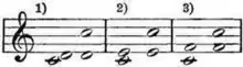 - трезвучие (основной вид) — с основным тоном в нижнем голосе.