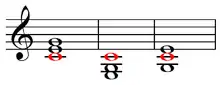 Обращением трезвучия называется такой его вид, в котором нижним звуком является терцовый или квинтовый тон основного трезвучия. Трезвучие может быть трёх видов, каждый из которого отличается от предыдущего тем, что нижний звук поднят на октаву выше (или верхний опущен на октаву ниже, как показано на рисунке). Проводимая операция также называется обращением[1]. Третье обращение приводит к возврату к начальной форме трезвучия — основному виду, расположенному на октаву выше (или ниже):