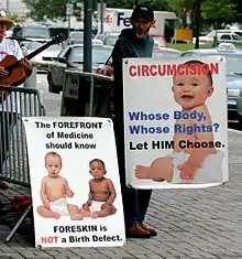 - Противоречие этическим нормам. С расцветом в девяностые годы XX века правозащитных и экологических организаций был сформулирован целый ряд этических проблем, связанных в том числе и со здоровьем. Заявляется, в частности, что удаление любой части тела человека без его согласия недопустимо, а поскольку младенец не может дать согласия на отсечение собственной крайней плоти, эта процедура в применении к детям изначально антигуманна и подлежит полному запрету.